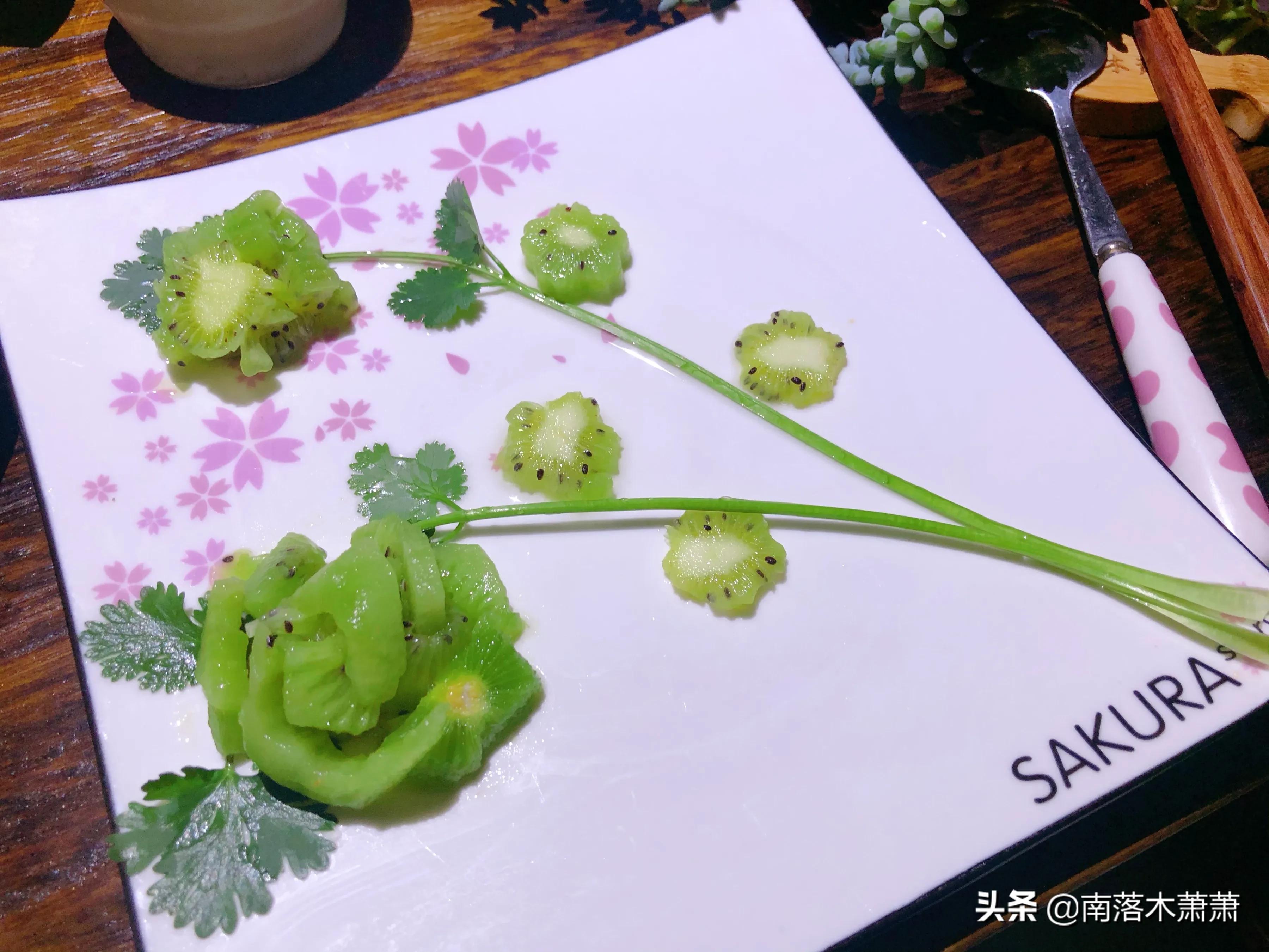 猕猴桃切花的做法,超级简单,只需要作为花束的配搭,我准备的是一根香菜,黄瓜也可以,生菜也可以,只要你想,就可以做出来花茎来。