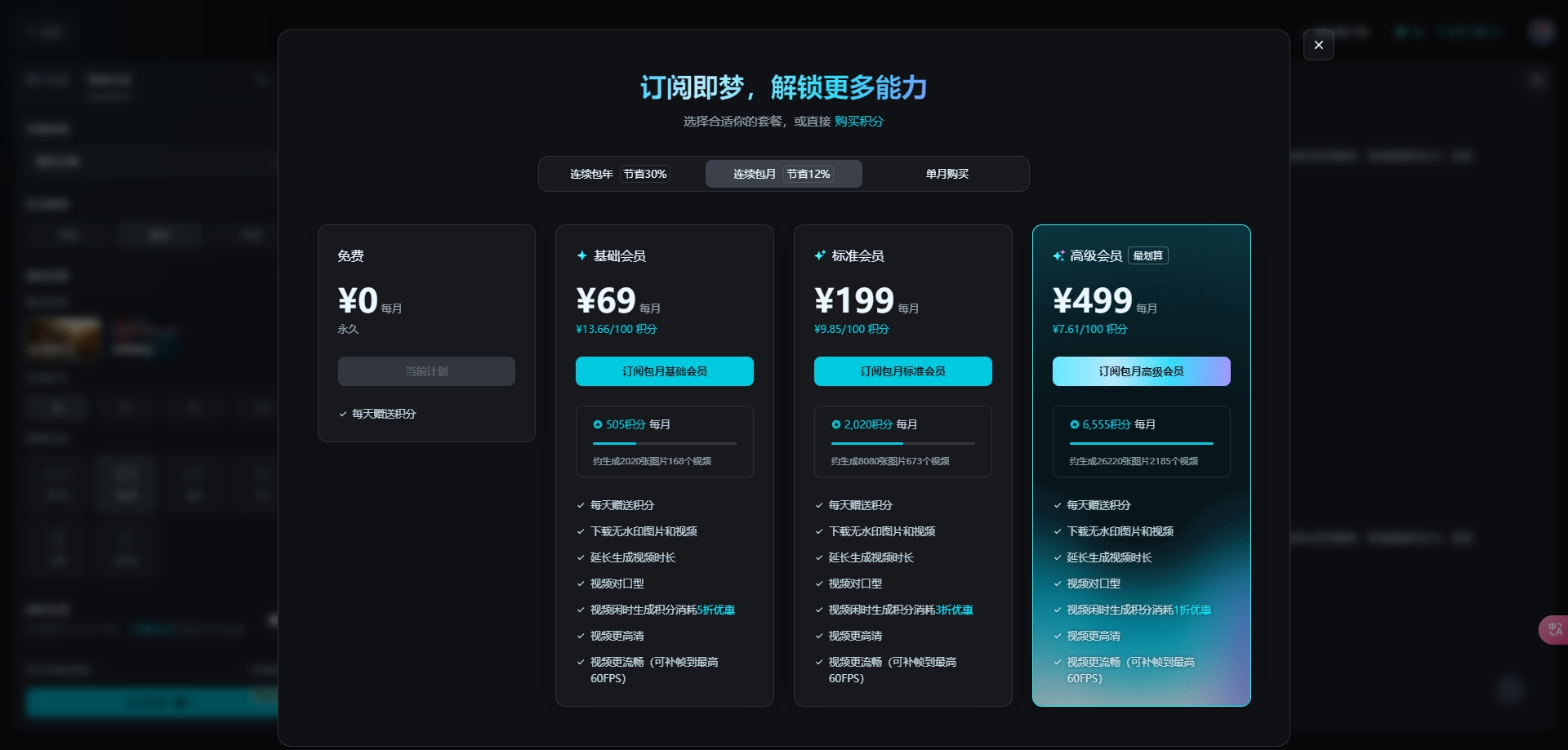 那如果说,不想老是这样靠着每天赠送的积分去生成有限的几条视频,