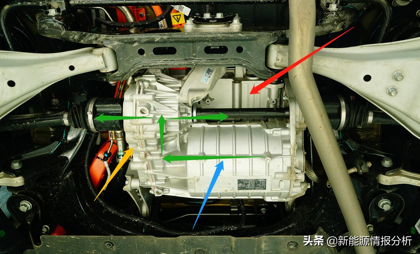 汇川提供的后置“3合1”电驱动系统,由电控系统、驱动电机和减速器构。驱动电机将扭矩输出至减速器然后分配给左右传动半轴(绿色箭头)。16000转/分的高转速,以及直接最大245扭矩的特性,需要对电机本体以及减速器有着强力的散热伺服能力,并且传动半轴(靠近减速器端)的强度足够大足够大,才可能应付持续“全油门”的顺势扭矩输出的可靠性。