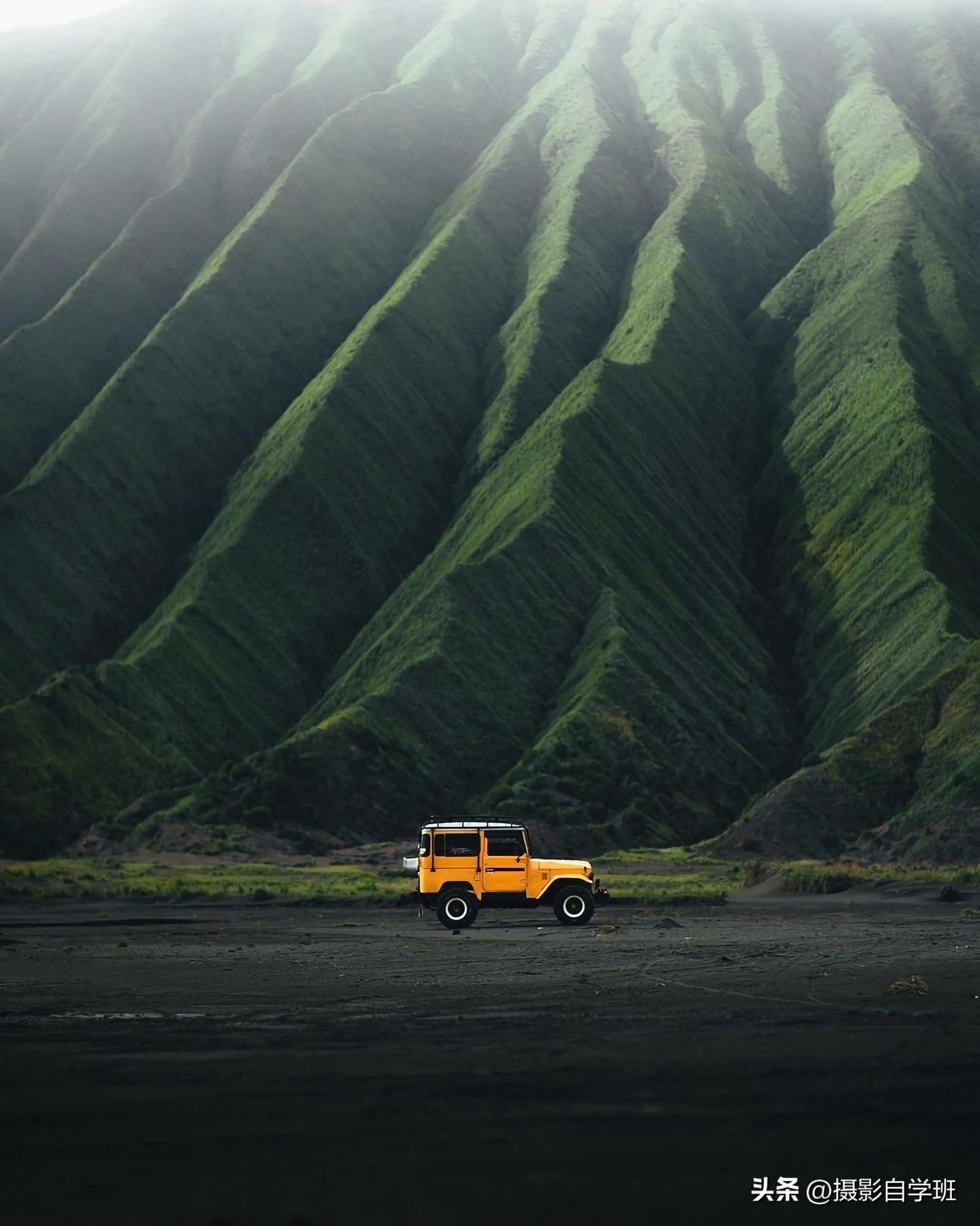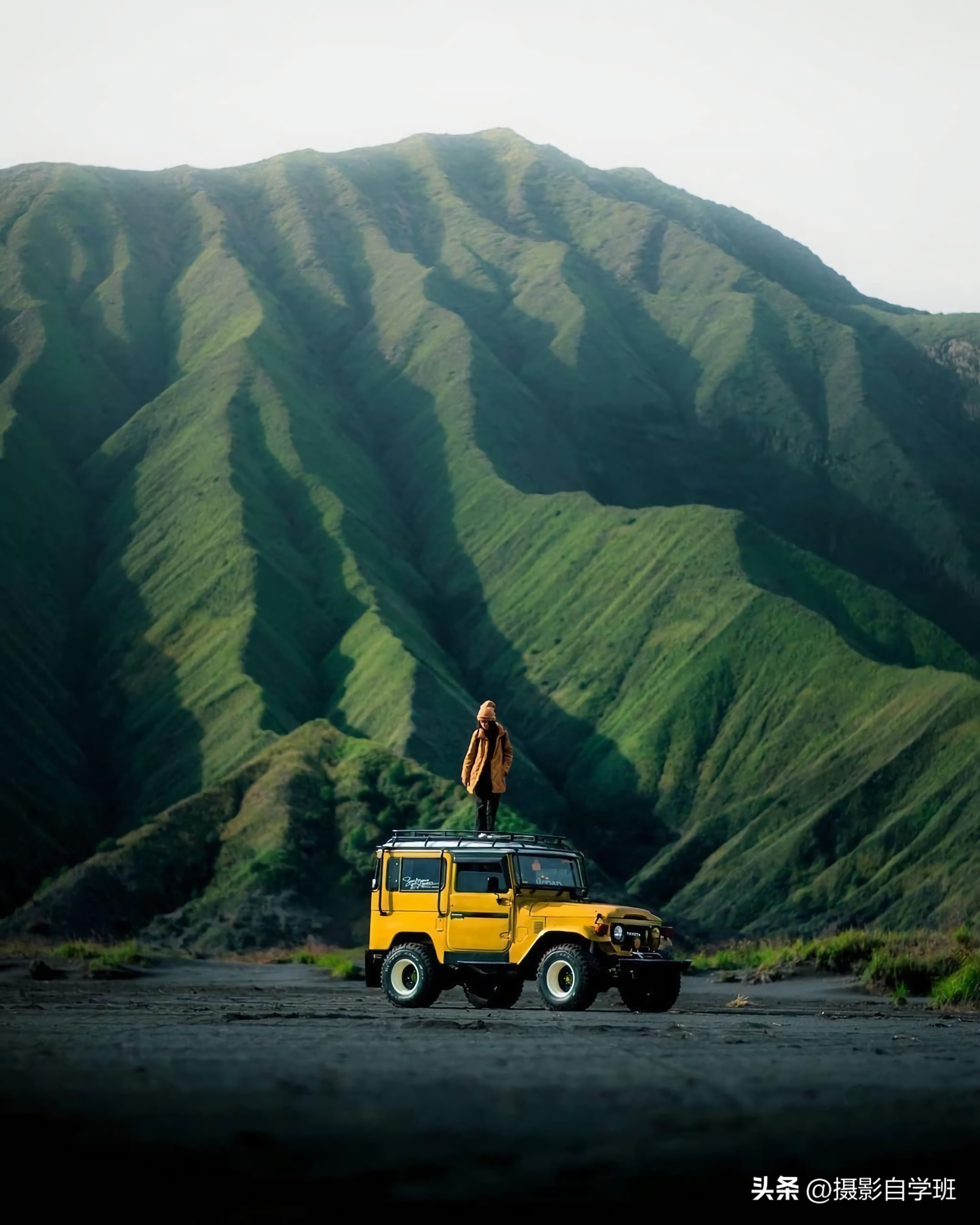 拍风景照片的时候,也要注意背景,上面这张照片,在上边缘,明显有惨白的部分。而拍摄的时候,可以缩小取景范围,避开过爆的部分画面,看起来会好很多。也要在画面当中,添加颜色对比,背景山脉都是绿色,主体人物和车都是黄色,没有其他杂色,画面更显简约。有面与点的对比,照片看起来更有张力,也不乱。