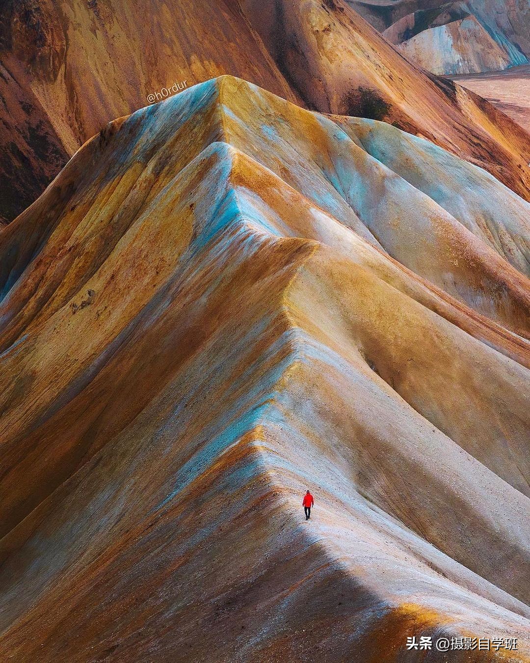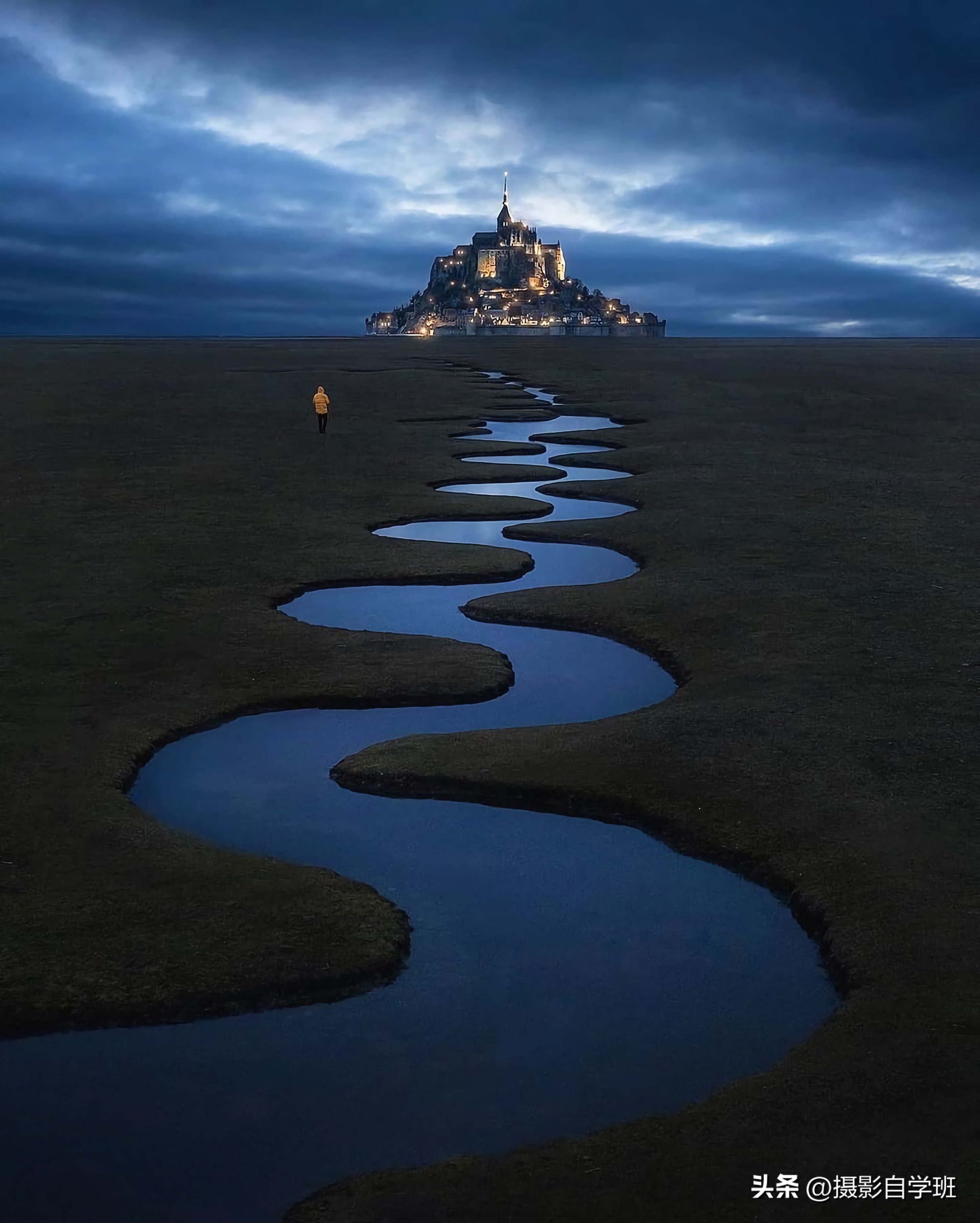 在风光摄影当中,很容易遇到上图与下图中的线条。线条,可能是河流,可能是山脉,可能是路,在拍摄的时候,要顺着他们向前拍,这样线条在画面中,纵贯向前,照片的纵深感,立体感就有了。但是更主要的是,在画面当中添加上,一个点。这个点,可以是上图这种的一个人,也可以是线条中的某一个景物。这样有了点与线的对比,照片看起来才不会那么单调。
