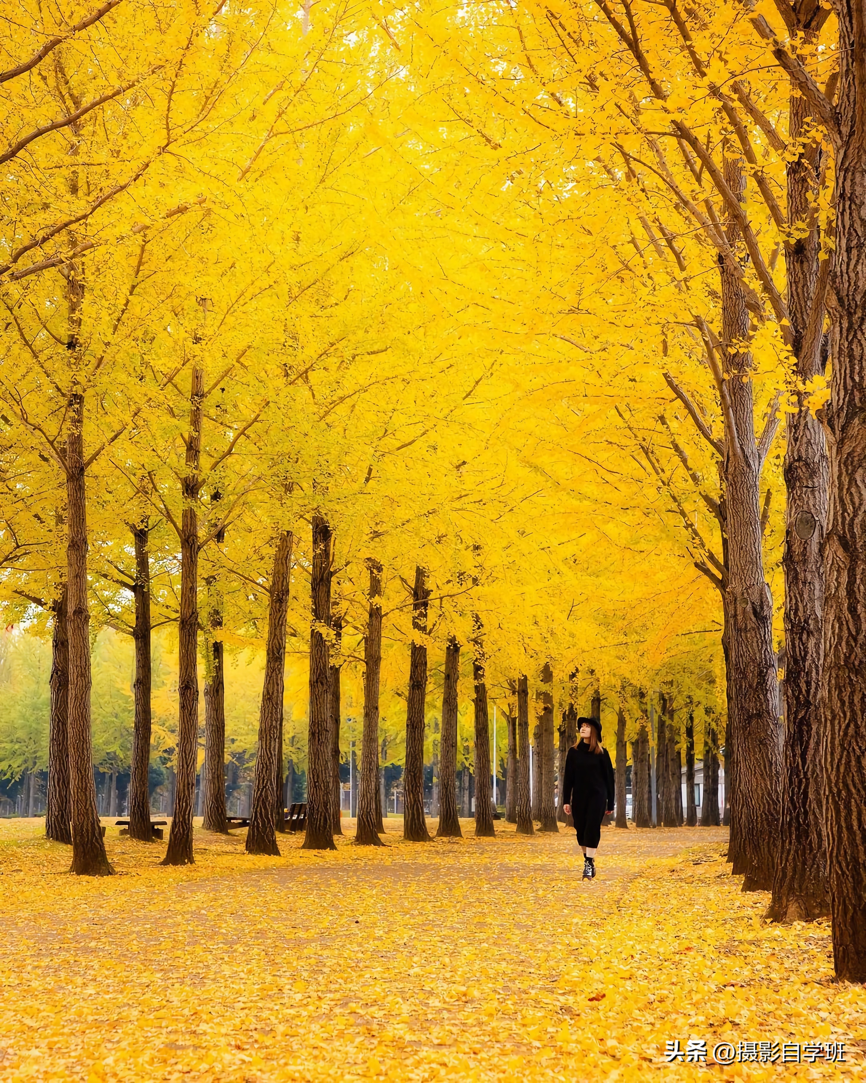 在一些小区、学校,非常容易遇到这样的场景。被拍摄的人,穿一个非黄色的衣服,走在树林当中形成对比,照片的主次,就更明显。单独只拍人或者单独只拍树林,就不会这么好看。另外像遇到这种有规律的景物,要顺着他向前拍,每一棵树像音符一样,递进向前,增加照片的韵律感。