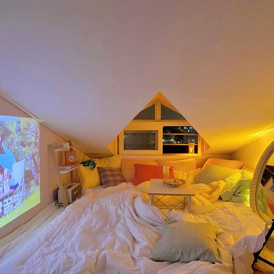 这是一个阁楼里的小家,巧妙的应用了阁楼的坡度做了一个天窗,可以透过窗户看看星星和月亮。