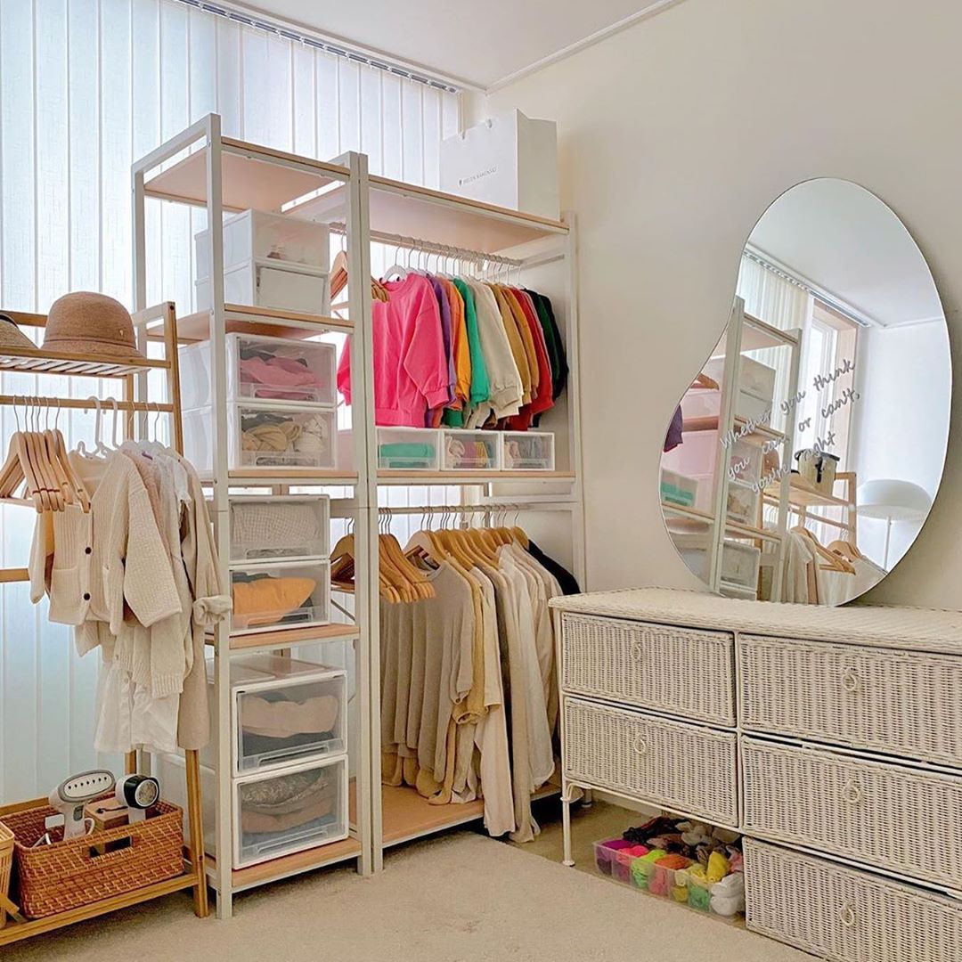 房间的内部,也是用收纳架把一年四季的衣服塞的满满当当,不占用空间的同时,看上去也很整洁干净。