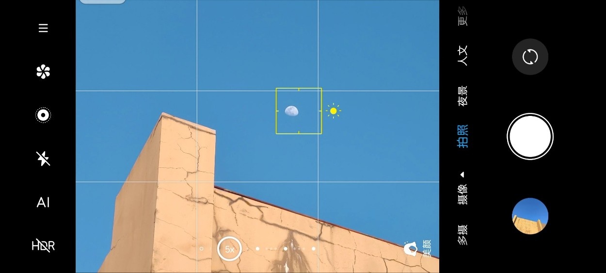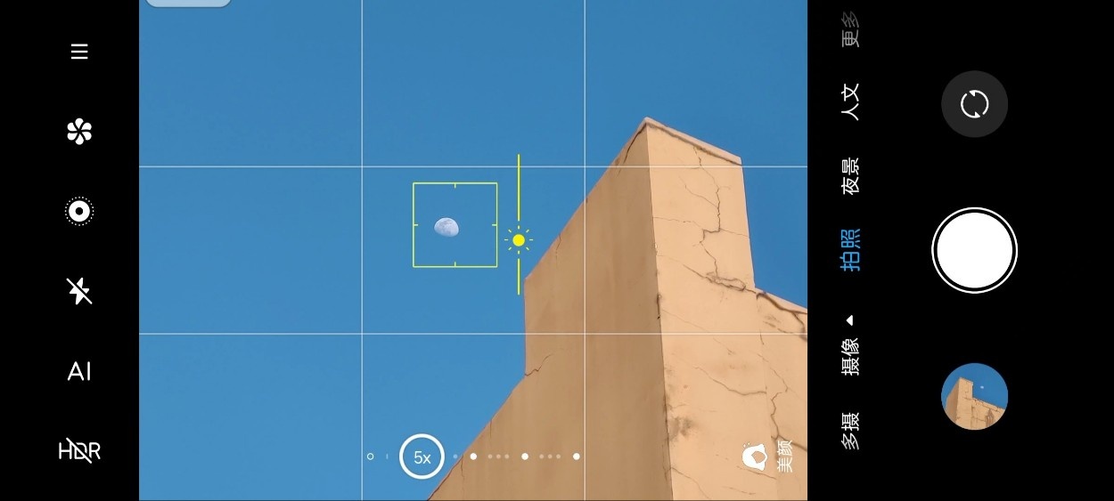 首先,手机拍月亮需要调整到3-10倍变焦,才能拍到更大的月亮,由于手机是广角镜头,在1X焦距下拍到的月亮很小,需要拉近焦距,大约3x-10x拍摄月亮。具体调整到几倍焦距,可以根据手机的光学变焦倍数来灵活调整,这次使用的中兴Axon 30 Ultra具备5倍光学变焦,直接调整到5x焦距拍摄,就能拍到清晰的月亮。
