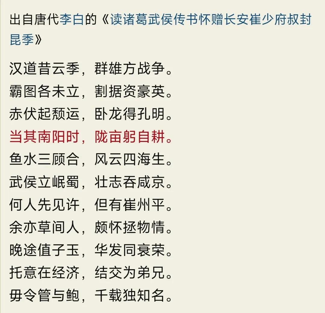 李白是唐玄宗时期的众人皆知的名人,(701年2月28日—762年12月)字太白,号青莲居士。李白在写下三首关于诸葛亮躬耕地的诗: