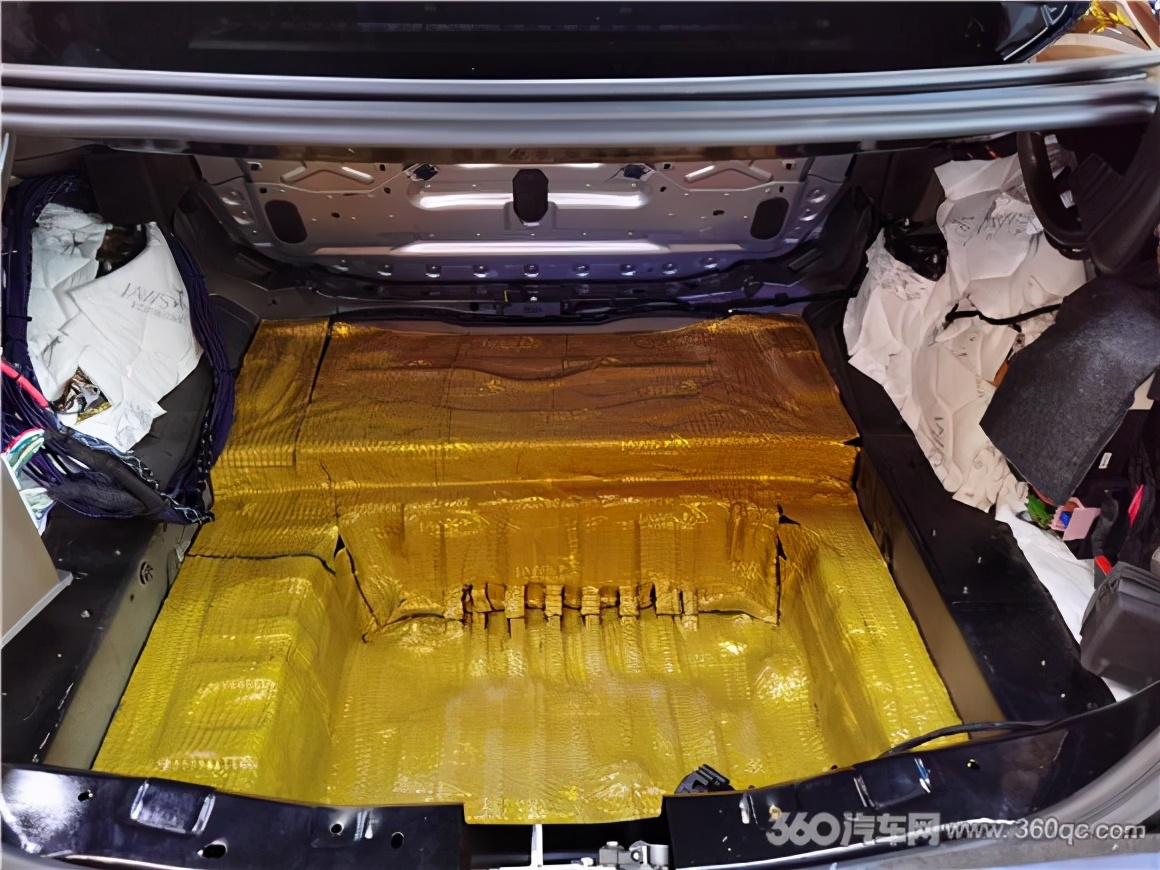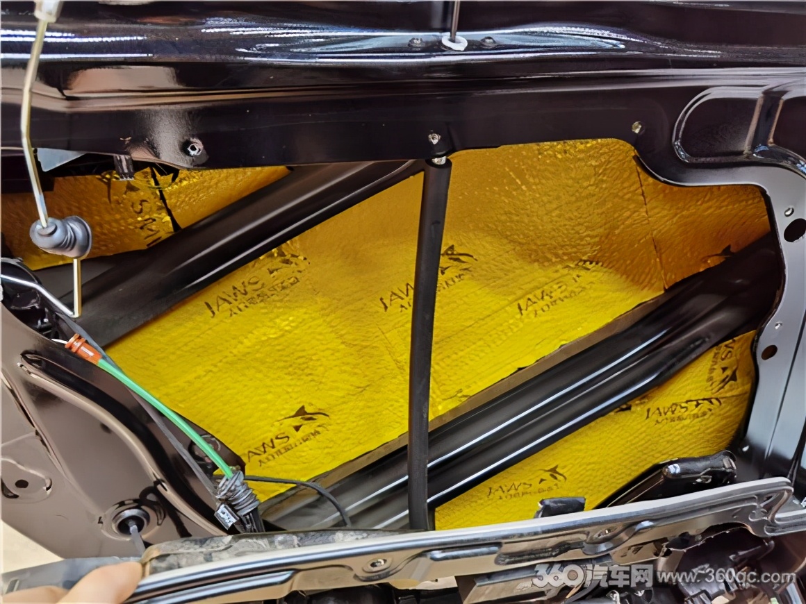 车厢内底盘的隔音处理,改装技师用金鲨JS300减震胶和银鲨吸音棉,进行双层隔音处理,代替原车的沥青阻尼,有效抵制车子在行驶中的共震,以及胎噪和路噪的传入。