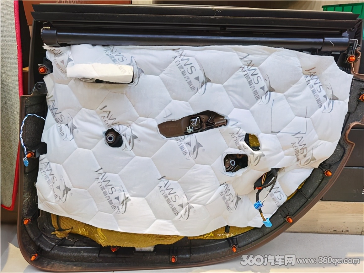 接下来就是大白鲨全车隔音处理。首先前后车门,先用金鲨JS300减震胶将车门钣金板做双层隔音处理,再用银鲨吸音棉将车门内饰板做隔音处理,有效杜绝车门的共震异响以及风噪的传入。