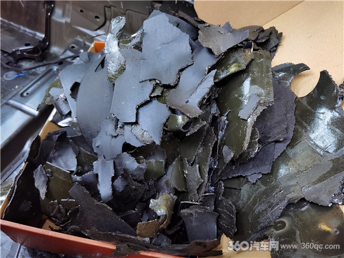 要想完全消除掉车内的异味,那就得把车内的沥青阻尼进行铲除。改装技师将E300车厢内的座椅和内饰都拆卸了出来,然后将粘贴在车体钣金板上的沥青一一铲除之后,再进行清洗干净,务必不留隐患。
