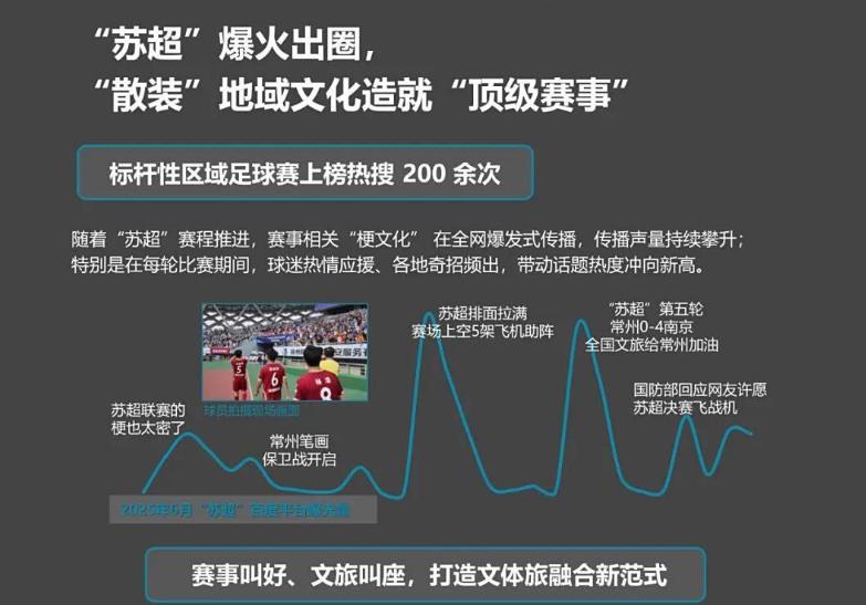 第二个引爆的热点,频度最高的词条当然就是“苏超” 。苏超在接棒国足后,在今年上半年热度一路高涨,成为体育领域别具一格的风景线。“比赛第一,友谊第十四” 玩梗的苏超用赛事组织的创新举措,以及与苏州本地文化的深度融合,用独具特色的助威口号、将楹联文化融入足球,使得 “苏超” 相关话题词条热度居高不下,(运动帮)充分彰显出民间足球赛事强大的生命力与广泛的吸引力,也为地方文化传播与经济发展注入新活力。苏超和国足两大事件可以说成为了2025年上半年体育话题和关心热度的顶流,无论是在各个领域,有什么热度事件发生,它们都能排在前三名之列,可以说妥妥的词条顶流中的顶流。