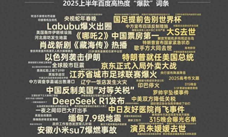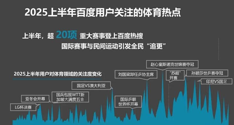 7月29日报道,百度热搜与中国广视索福瑞媒介研究(CSM)联合发布《2025百度热搜年中报告》出炉,基于海量热点数据与深度洞察,各榜单全景扫描上半年国民关注的焦点,其中体育类话题频繁上榜,并且多个热点一直霸榜。