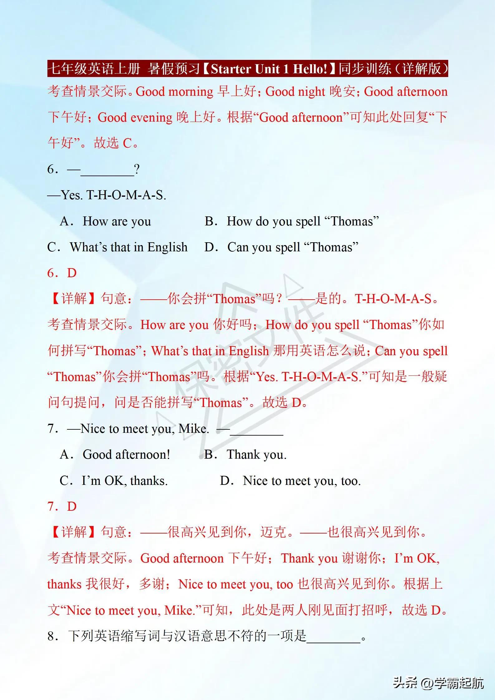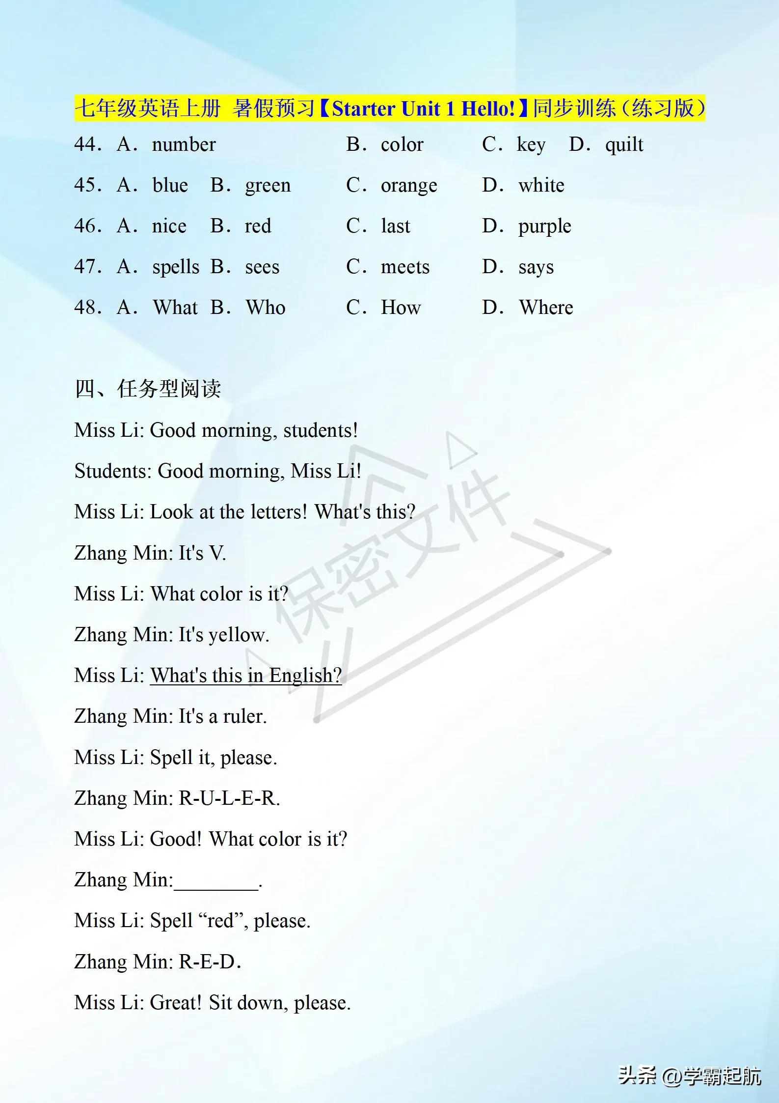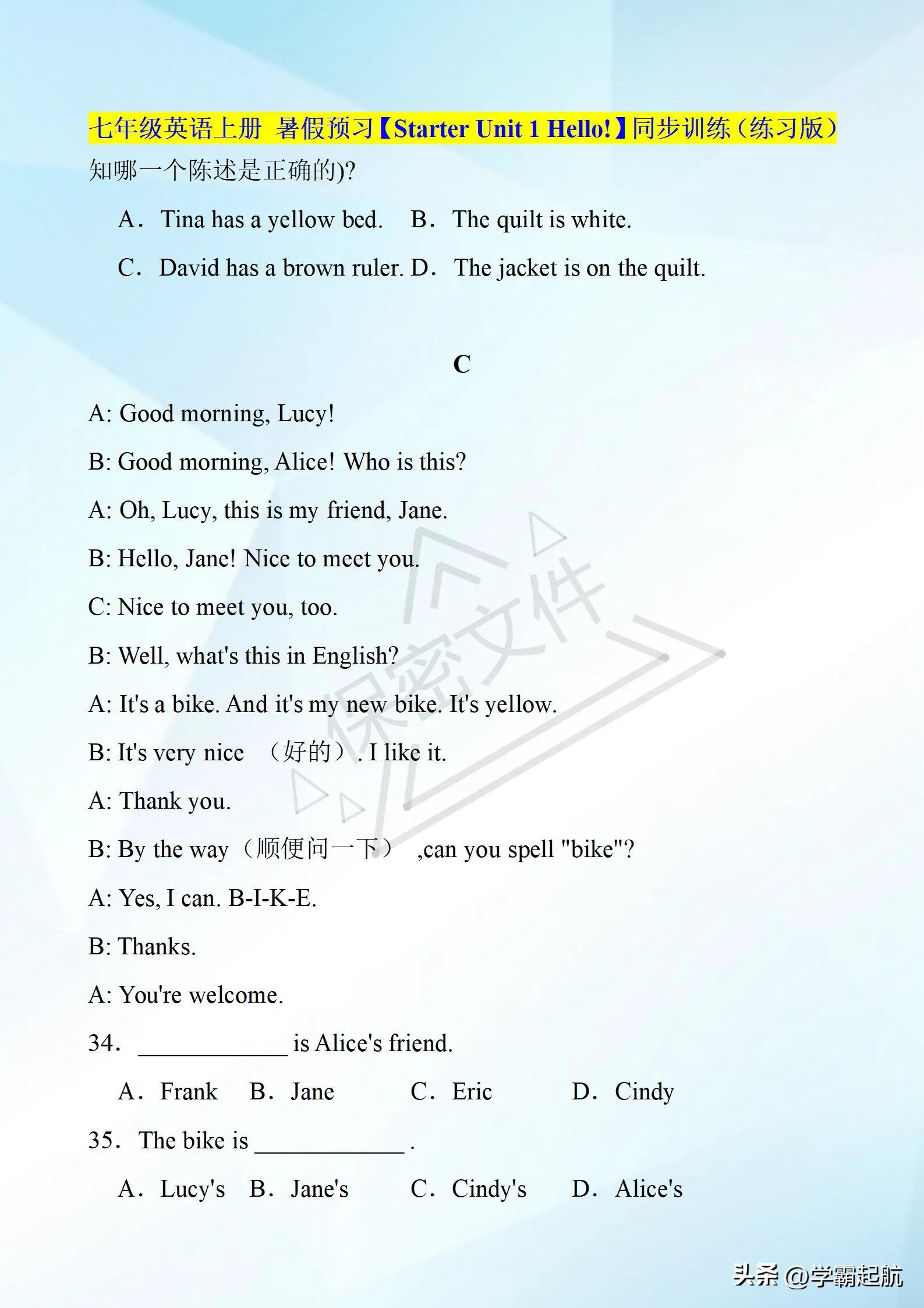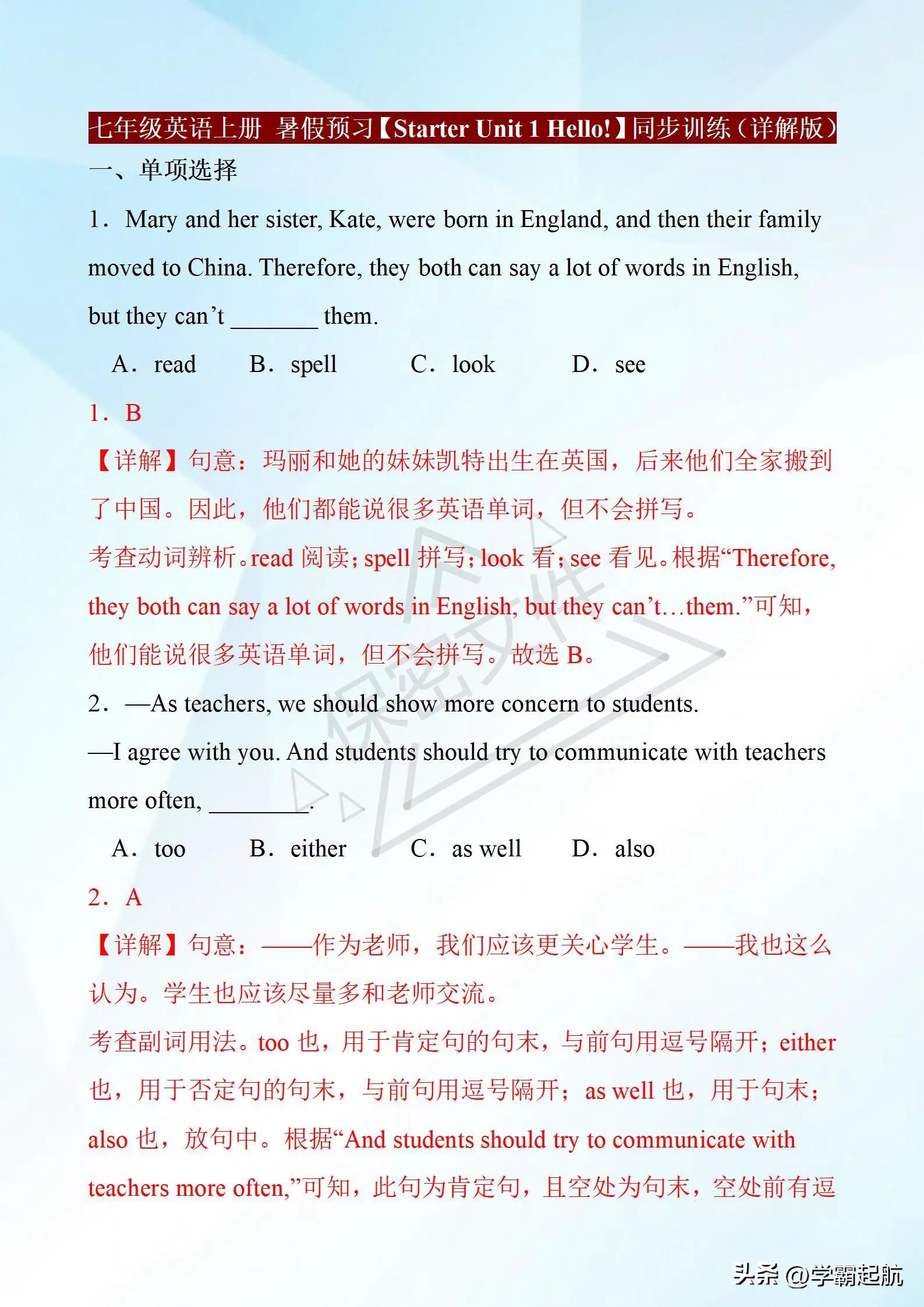 七年级英语上册,暑假结合课本预习各单元内容后,也要进行同步训练。通过训练,了解单元重点以及自己的难点,开学后才能更有针对性学习。今天,我便会分享初一英语上册《Starter Unit 1 Hello!》同步训练,希望对你的暑假预习有所帮助。