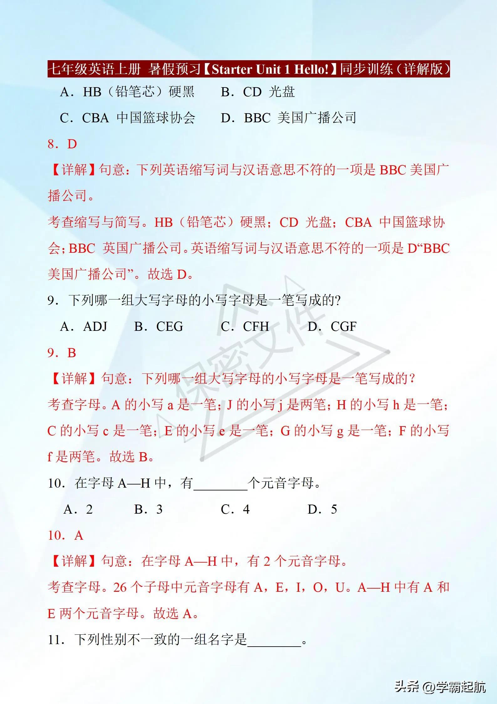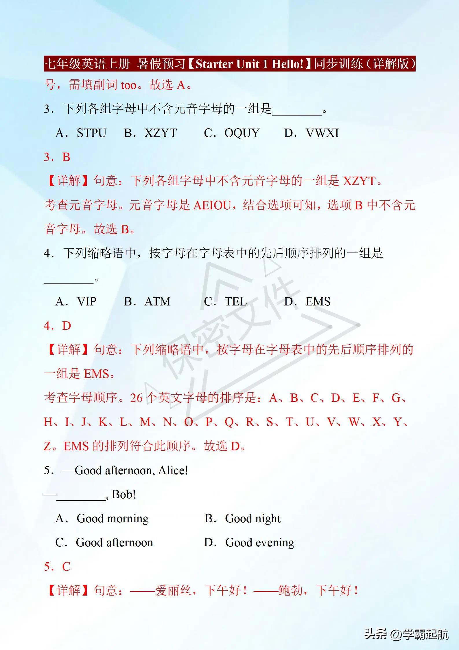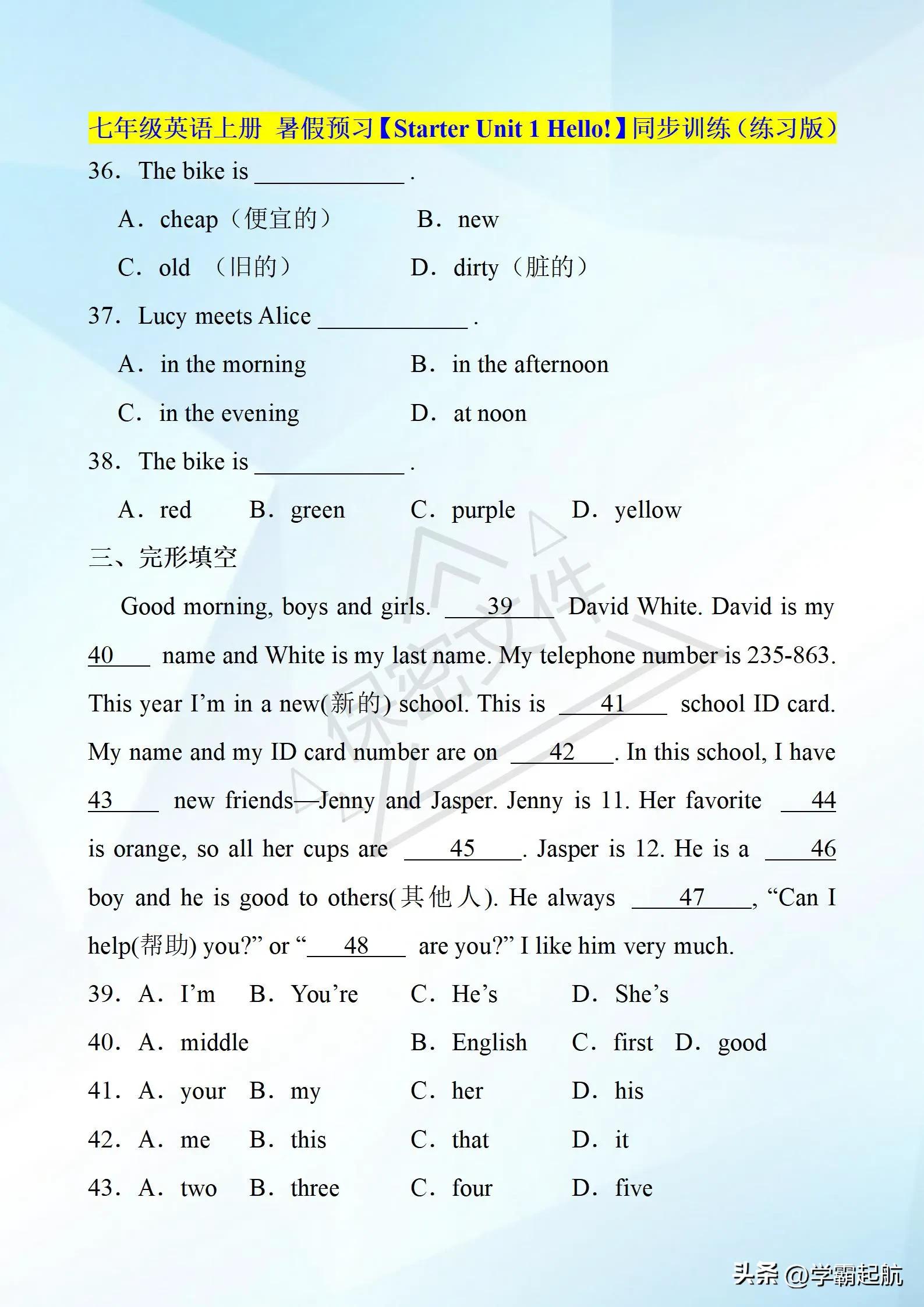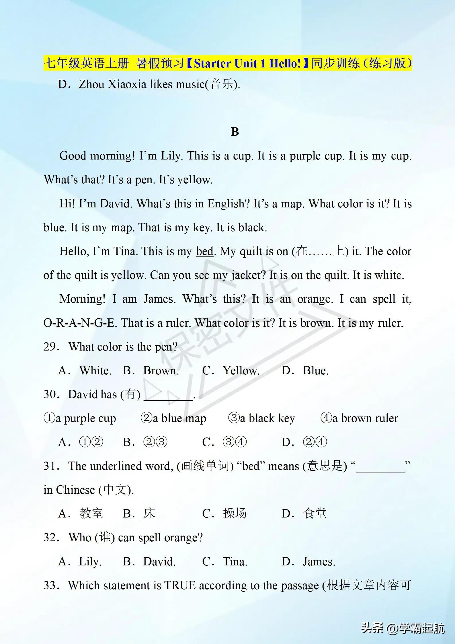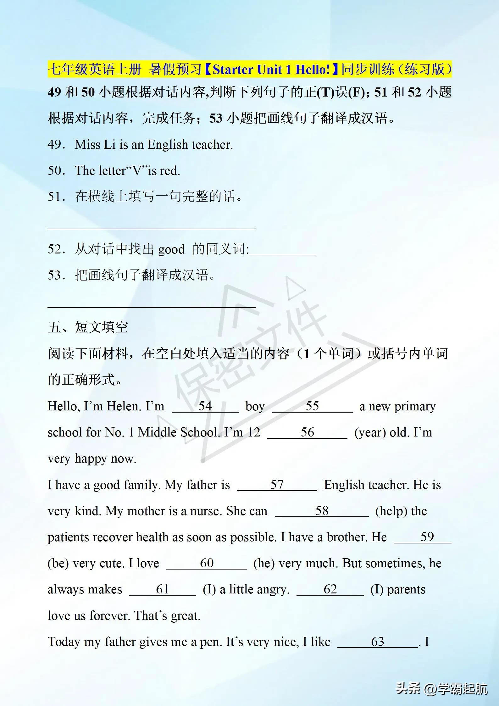 七年级英语上册,暑假结合课本预习各单元内容后,也要进行同步训练。通过训练,了解单元重点以及自己的难点,开学后才能更有针对性学习。今天,我便会分享初一英语上册《Starter Unit 1 Hello!》同步训练,希望对你的暑假预习有所帮助。