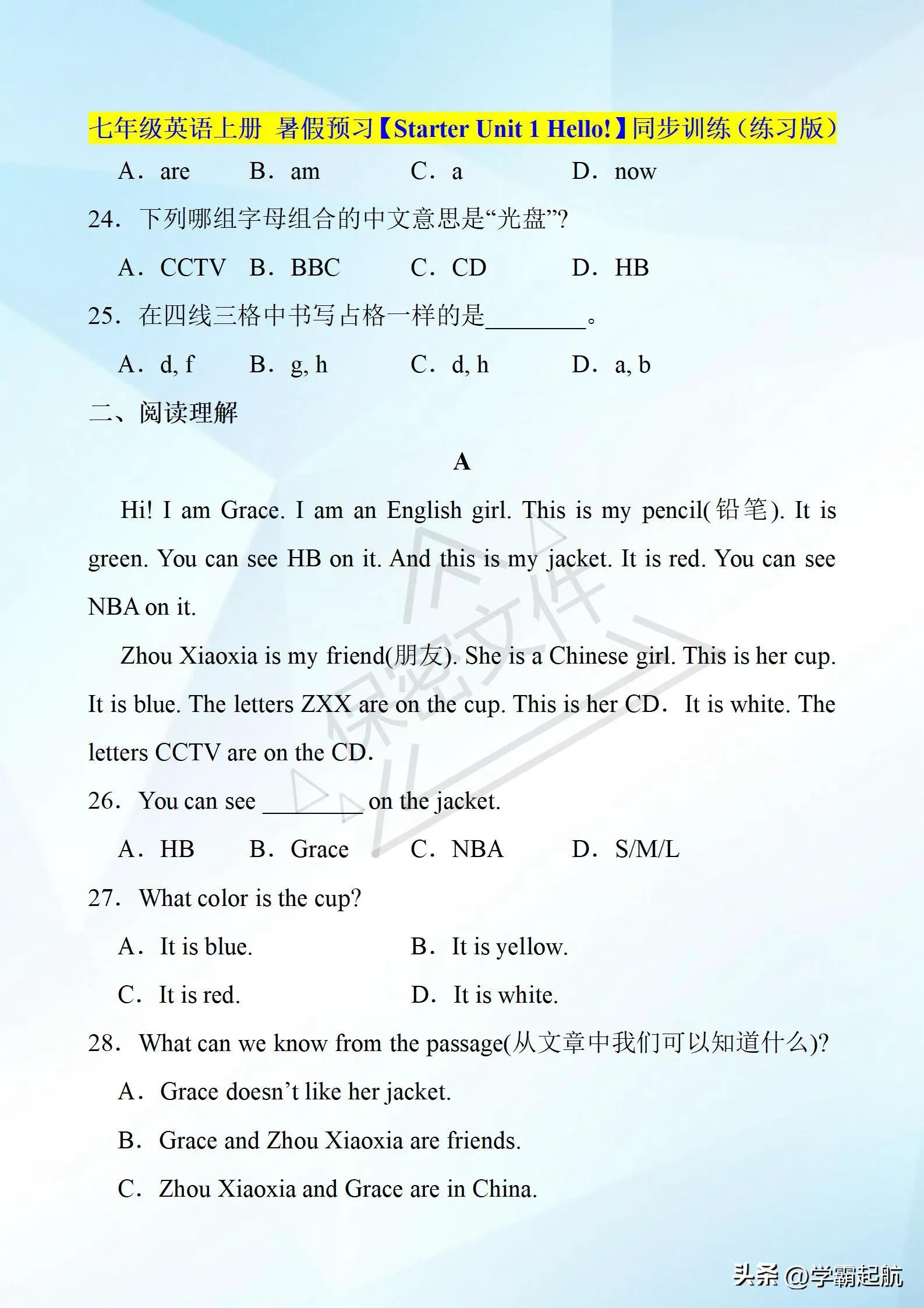 初一新生暑假预习必备:七年级英语上册单元同步训练,含答案