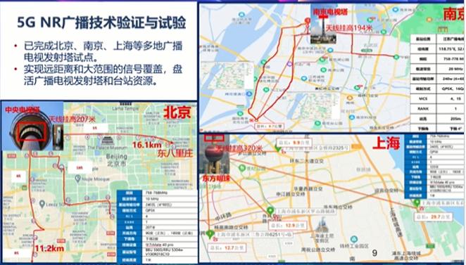 在现有的电视大塔上,通过5GNR技术进行大范围的信号覆盖。即无线信号以大功率广播方式实现远距离的传输,用户可以在静止及运动的场景下,用5G手机APP应用能够接收电视大塔发射的无线信号并收看电视节目。目前已经完成北京、上海、南京试点。
