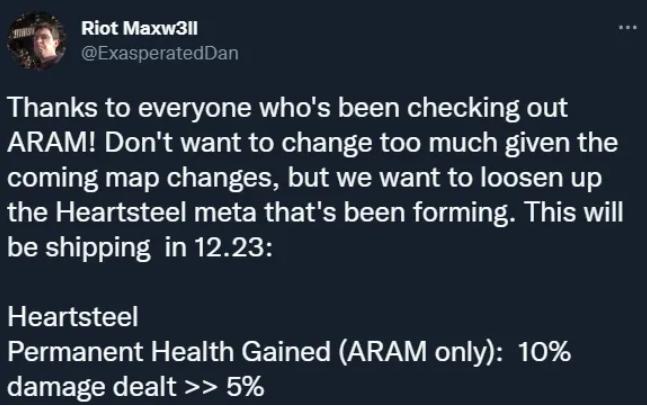 虽然说了这么多,但是心之钢神教大概也要到此为止了。就在下午,LoL的设计师注意到了这件装备在大乱斗中的影响,思忖半天还是决定在下个版本进行削弱: