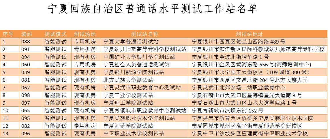 宁夏共有13个普通话水平测试工作站,其中12个测试站都设在各高校内,针对在校大学生,测试时间由各学校自主安排,学生可在各自的学校咨询,一般寒暑假不安排测试。