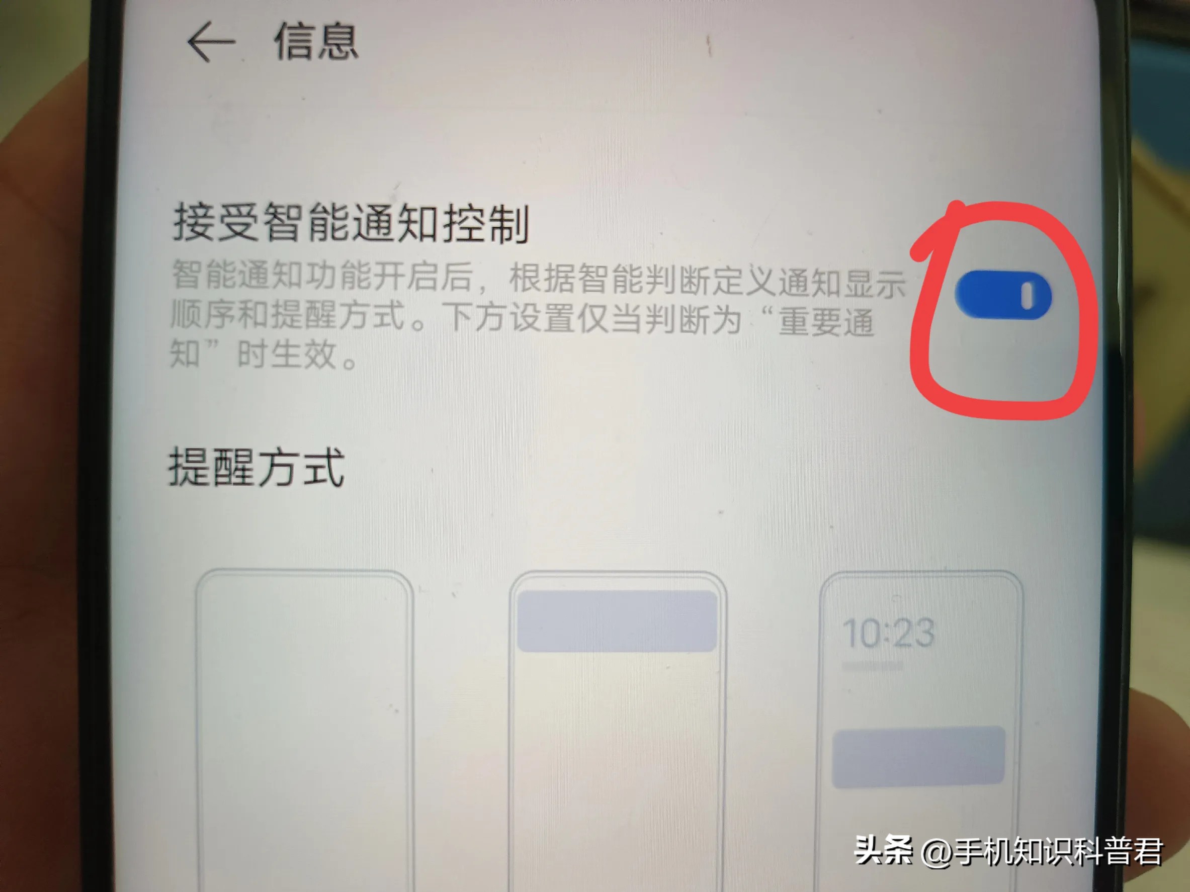进入此页面,能看到“接受智能通知控制”的选项,一定要把这个开关打开,这样系统才能根据智能判断定义通知显示顺序和提醒方式(如上图所示)
