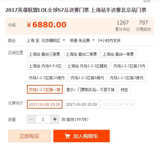 对比了一下全球总决赛上海站已经确定了的黄牛票价格,480元的门票卖出了6880元,涨了接近15倍。北京鸟巢的门票价值过万应该也是“指日可待”了吧!