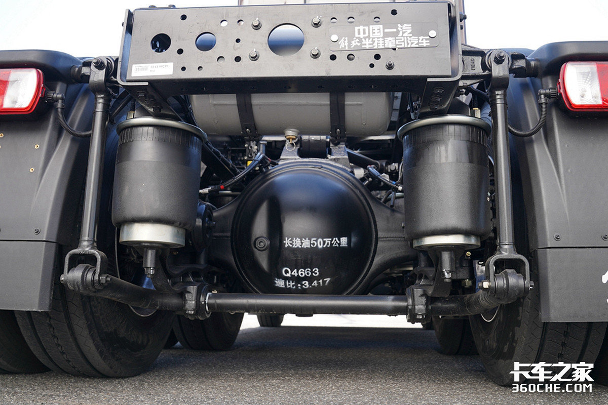 后桥主减速比为3.417,换油周期高达50万公里,减少进站保养的次数也是提高出勤率的一个重要手段。底盘采用的是前板簧后气囊的悬架结构,可通过驾驶室的操作手柄控制充放气功能,调整车身高度,实现快速甩挂,为用户提供高效物流运输方案。