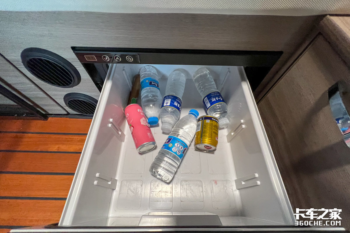 卧铺的下方是储物盒以及车载冰箱,有了冰箱后就能够随时喝上冰冻饮料降暑解渴,平时自己做菜的卡友也可以非常方便地保存新鲜的蔬菜和肉类。