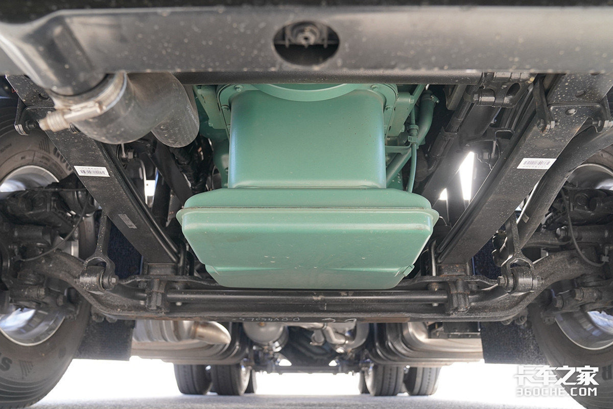 底盘方面,主副油箱设计,总容积达到1200升,加满一箱油即可满足国内绝大多数长距离运输任务。尿素箱与副油箱为一体式设计,让原本紧凑的底盘空间利用率更高,同时也起到了整齐美观的作用。