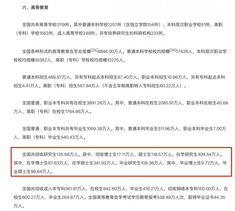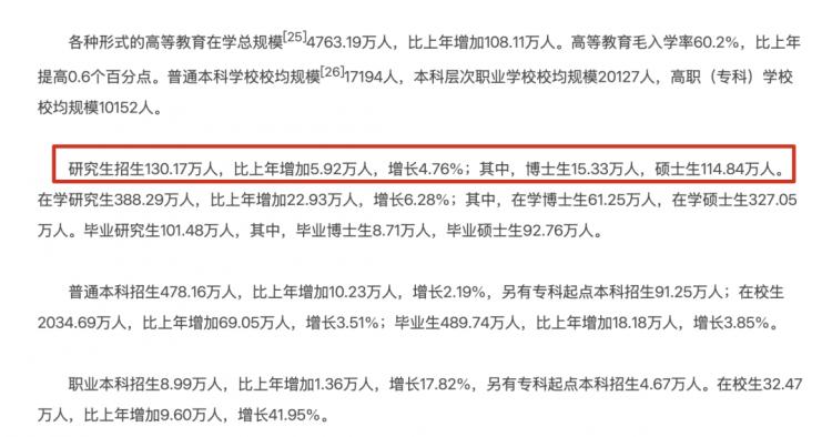 而在2023年全国教育事业发展统计公报,23年研究生招生130.17万人,其中,博士生15.33万人,硕士生114.84万人。