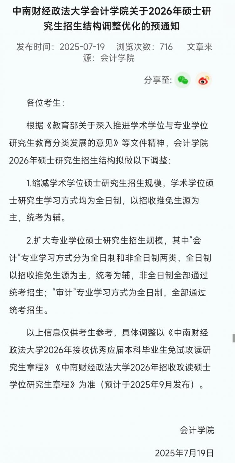 中南财经政法大学826会计学硕缩招,估计今年该校该专业的热度会下降。