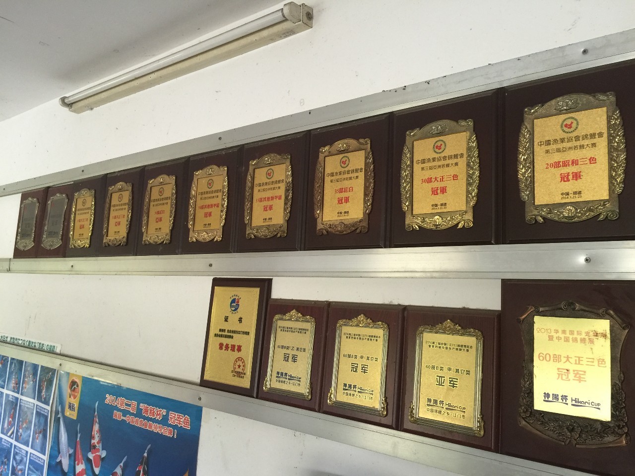 在江门市荷塘镇开锦鲤场的黄锦明,人称“牛哥”,除了样貌长得神似广东著名演员鲁牛以外,多半还包含着他在锦鲤方面的“牛气”,在他的养殖场里,一列醒目的奖牌,还有大大小小的各种奖杯,述说着他在锦鲤养殖方面的成就。