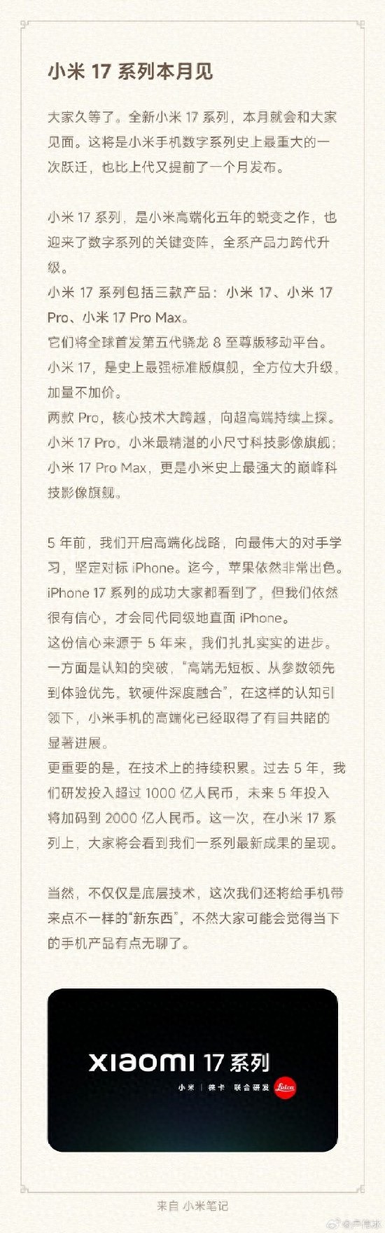 小米17本月发布,全球首发第五代骁龙8至尊版!小米集团总裁卢伟冰:依然很有信心,才会同代同级直面iPhone