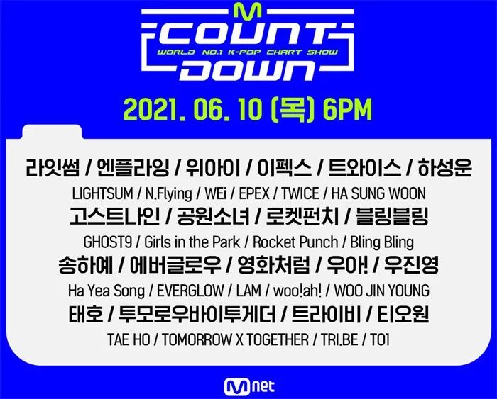 6月10日,播出的Mnet《M Countdown》阵容中,共有19组出演。