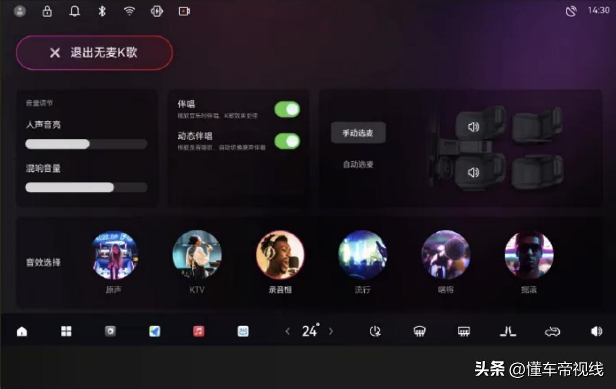 - 无麦K歌:开启无麦K歌后,无需手持麦克风。一键打开无麦K歌里的伴唱(通过屏幕、智能语音和方向盘自定义按键快速进入、退出无麦K歌),系统将自动去掉歌曲中的原唱。