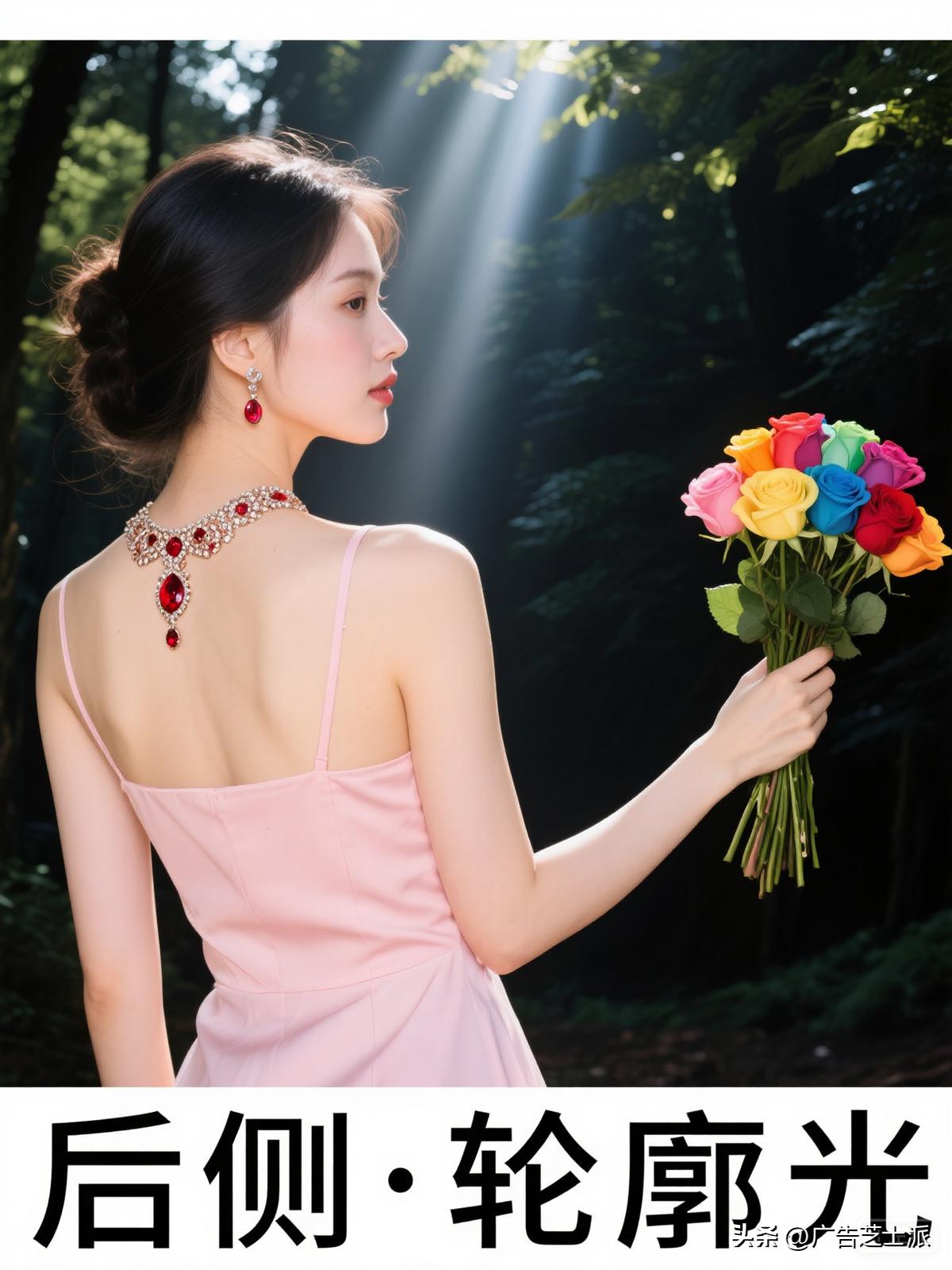 一位漂亮苗条的美女半身照,穿淡粉色吊带裙,戴红宝石项链,红宝石耳环,微笑露出两颗牙齿,手中拿着一束七色玫瑰花,站在暗黑的森林中,丁达尔光,概念光影,多巴胺风格,杰作,实景,相机拍摄,高质量细节,细节生动,用笔灵活,自然之美,大光圈,背景虚化,彩色光斑,中景,32K高清高分辨率