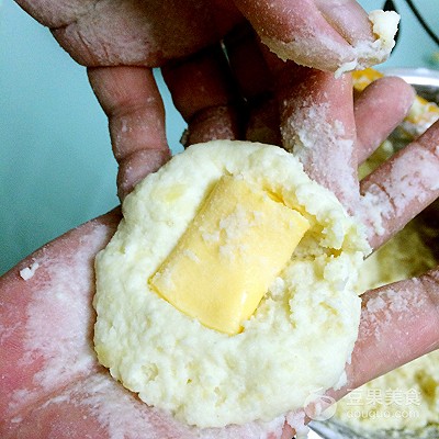 6、把土豆泥搓成圆形按扁或按中间,把切好的芝士放进去继续搓圆,好像做汤圆一样。