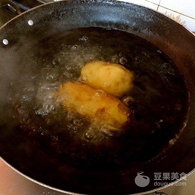 8、下油锅,小火慢炸,一次放五六颗就好了,别贪多。大概炸4~5分钟薯球呈金黄色就可以了。