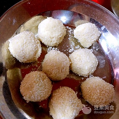 7、搓好后把薯球蘸上面包糠放一边,准备一下油锅或把卫生先搞好。