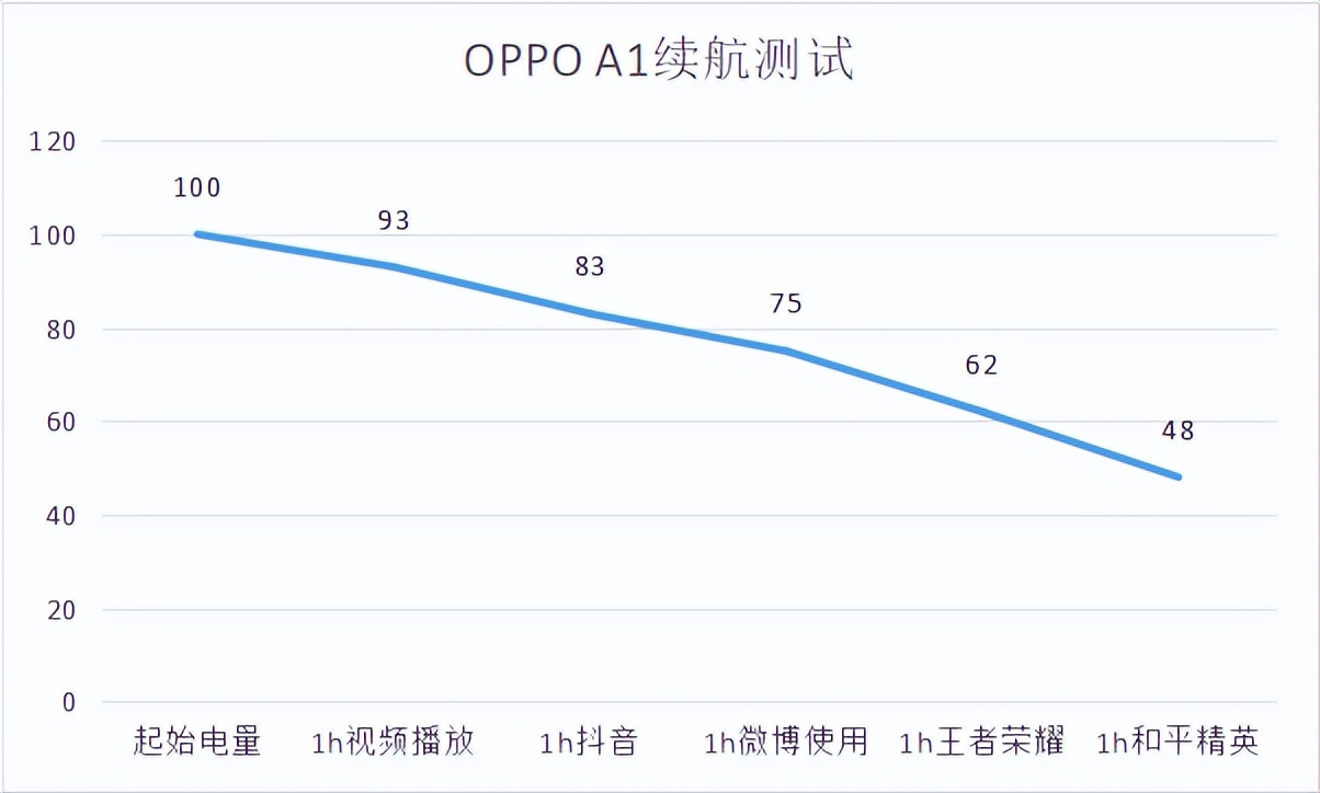 首先,OPPO A1在充满电的情况下连接WiFi,将屏幕亮度和音量分别设置为50%,并且关闭蓝牙和定位功能。先后进行了1小时的视频播放、1小时的微信聊天、1小时的微博使用和1小时的王者荣耀以及1小时和平精英,共计5小时的集中使用。
