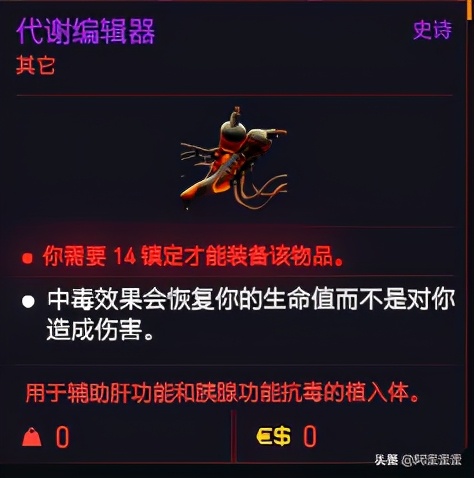 代谢编辑器义体,可以免疫毒伤并在中毒时会缓慢恢复生命值。