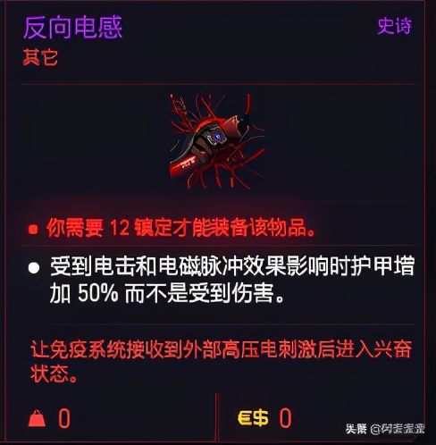 反向感电义体,可以免疫电击伤害并在受到电击时提高护甲值。