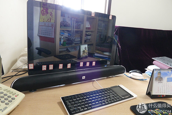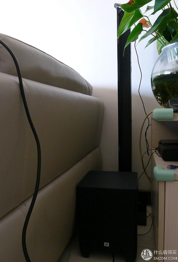 另外,音箱后面蓝色的电源灯在电视屏幕下面反射出来,看着比较碍眼。