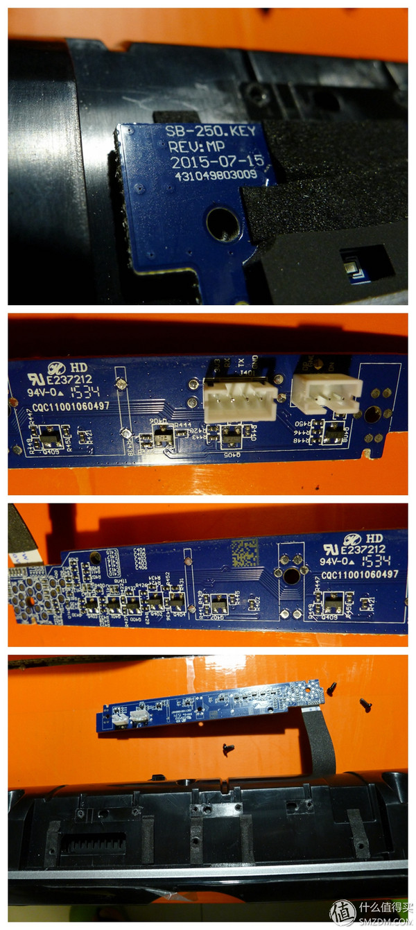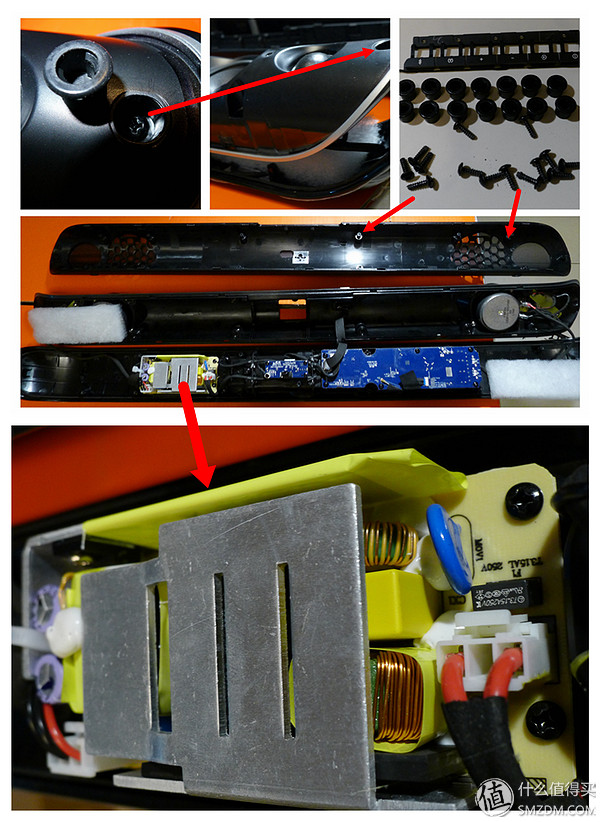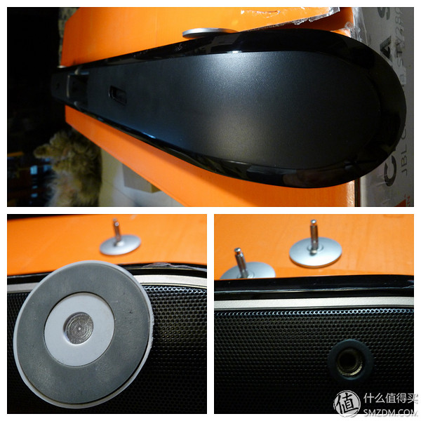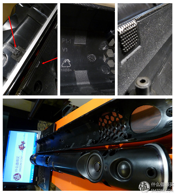 首先把条形音箱的两个减震脚钉取下,脚钉的边缘比较锋利斜角时容易刮伤桌面。然后从两侧弧形接缝处下手可以轻轻翘起,一点点把整个面板揭开。↓↓↓