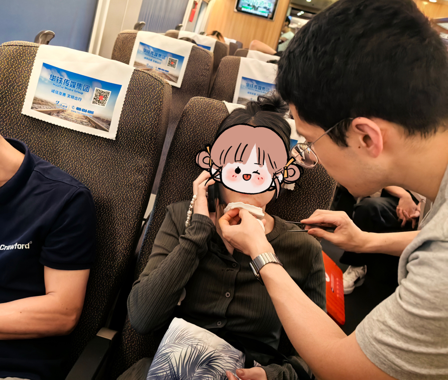 邹怡然没有犹豫,冲上前将其扶起,并迅速进行了专业检查,发现其颏部出现长约3cm皮肤裂伤,鲜血不断渗出,口腔内黏膜也严重损伤。由于列车此时已经到达,邹怡然立刻将患者扶上车,并在乘务长协助下对该乘客皮肤裂伤进行简单清创包扎处理,及时给予安慰,缓解其紧张的情绪。