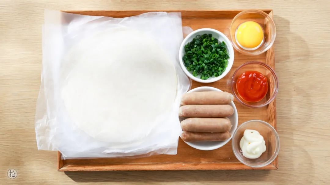 手抓饼/4张、香肠/6根、蛋黄/1个、沙拉酱、番茄酱、葱花/适量