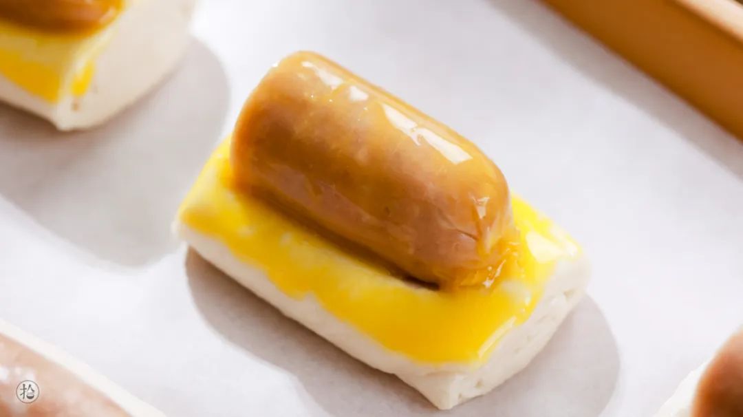 3.饼皮小段整理成长方形,放上香肠,刷上蛋黄液,蛋黄液也可以用全蛋液替代。