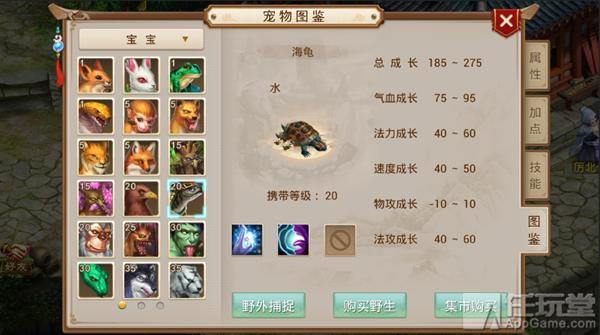 游戏中的宠物可以分为野生、宝宝和变异宠物三个类别。其中野生宠物可以从野外进行捕捉或是在董老头那里购买;宠物宝宝可以通过从野外捕捉,不过,十次外出可以碰到一次宝宝,已是极好的运气了,除野外捕捉外,对野生宠物使用归元露洗宠也可获得对应的宝宝;变异宠物无法从野外进行捕捉,需要收集召唤令到屠娇娇那里兑换。三种宠物的获取方式不同,其优缺点也有差异:野生宠物在捕获的时候,级别较高,但是成长潜力要弱于宝宝和变异宠物,一般不具有培养价值;宠物宝宝虽然在被捕获的时候仅为1级,但是成长潜力大,玩家悉心培养后,战斗力不俗;变异宠物外形和其他宠物有明显差异,其稀有性让拥有变异宠物的玩家变得与众不同。作为一款可以进行自由交易的游戏,除了官方的获取方式外,各位玩家还可以到集市进行交易,获取自己喜爱的宠物。