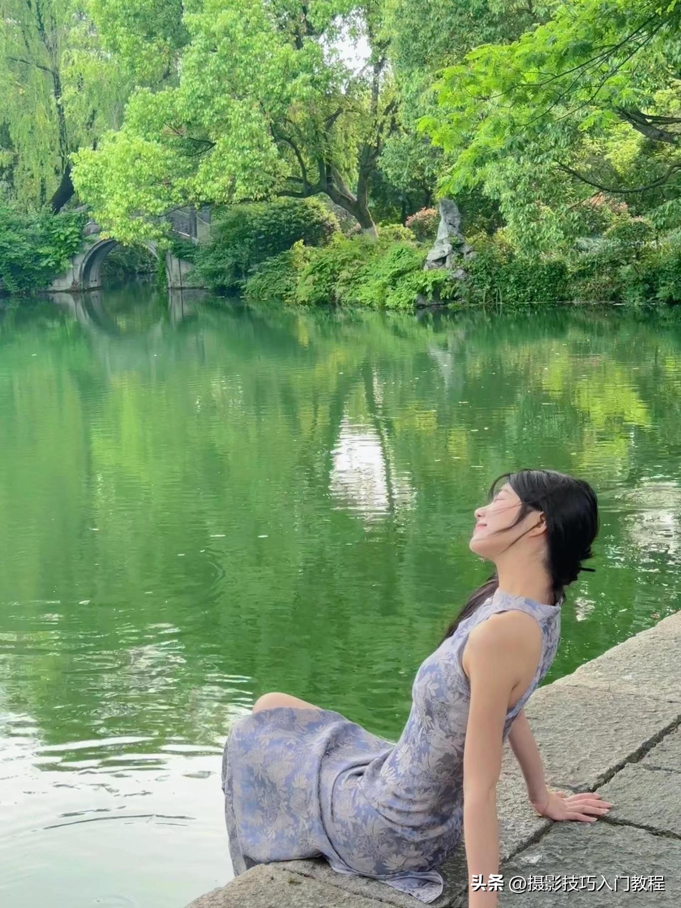 1、选择一处有水有树的地方作为背景,人像坐在水边的石墩上,双手交叠放在腿上,歪头闭眼微笑。
