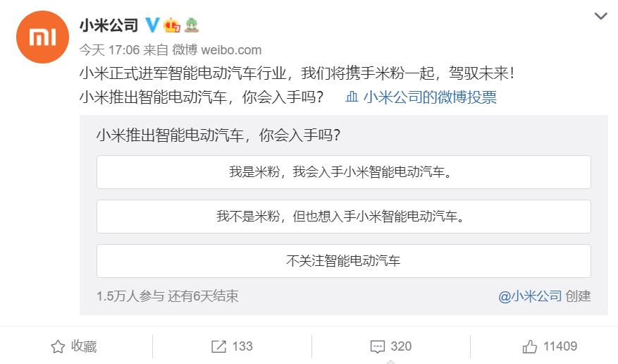 所以当这些米粉这么热情的告诉我的时候,我真的挺感动的。只要小米敢造,他们就敢买。这话听得真的,有时候也挺感动的。其实期待小米造车的朋友非常之多,在发布会前,我们小米公司的官微做了一个简单的调查。