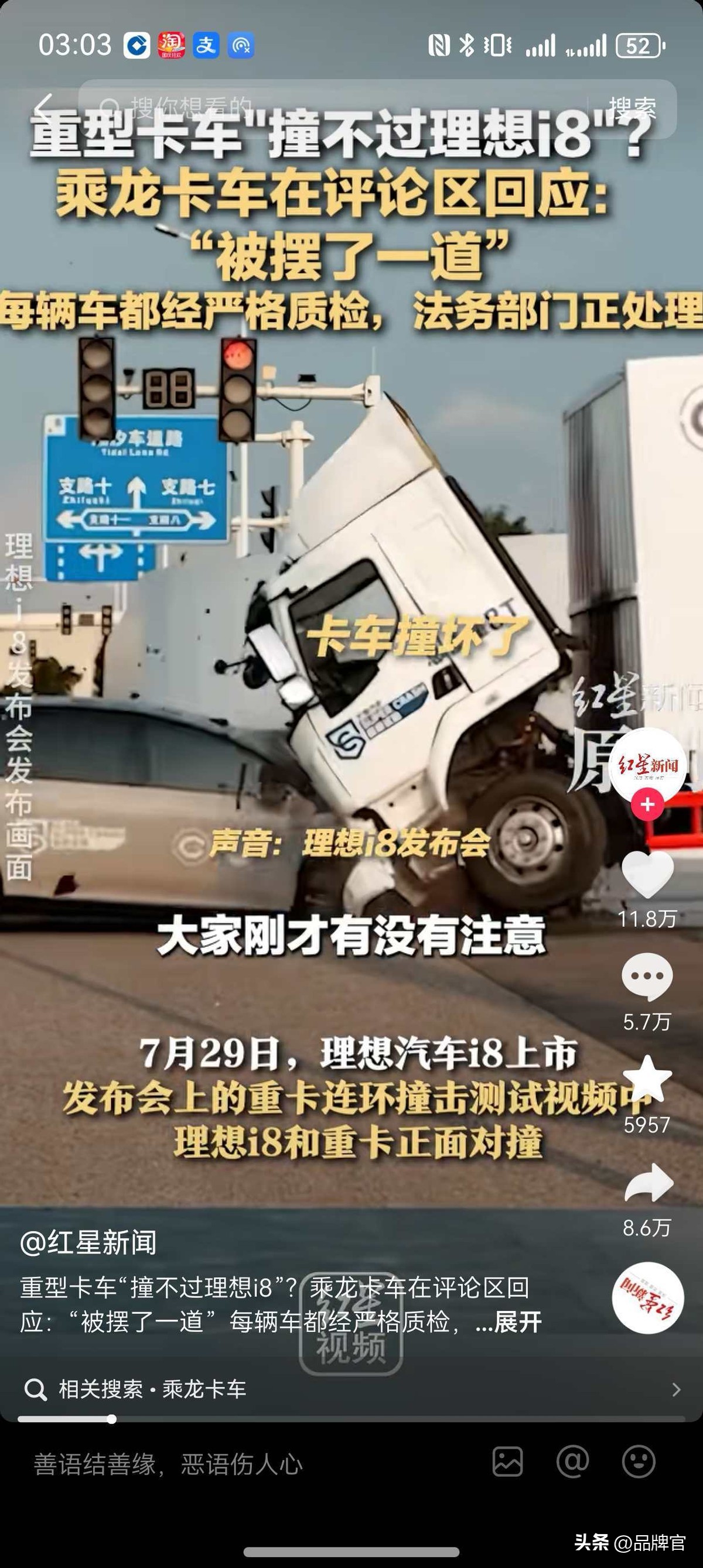 在视频中一辆理想I8把一辆8吨重的大卡车给撞飞了。这条视频在网络上引起了巨大的讨论,有眼见的网友发现,被撞的这辆重卡是东风柳汽的乘龙大卡车。