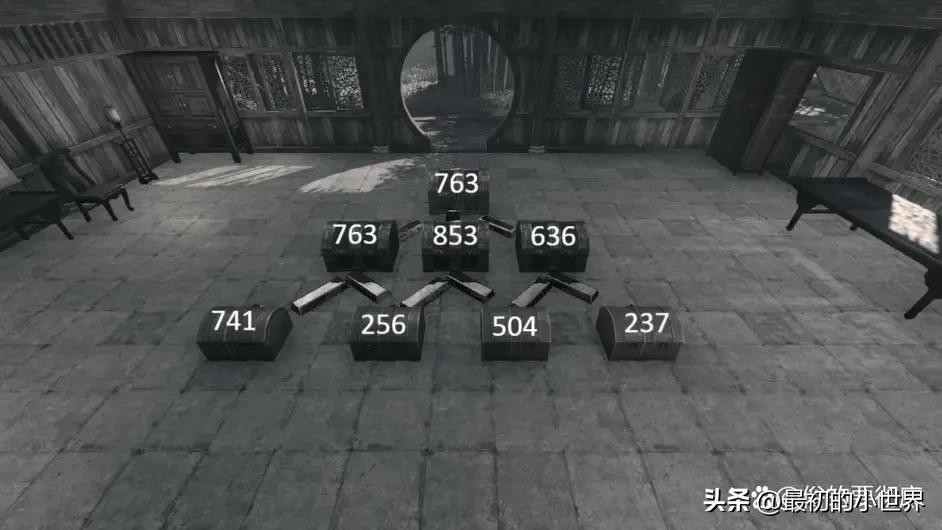 ①回到屋子(144,172)看到8个宝箱,根据箱子的提示