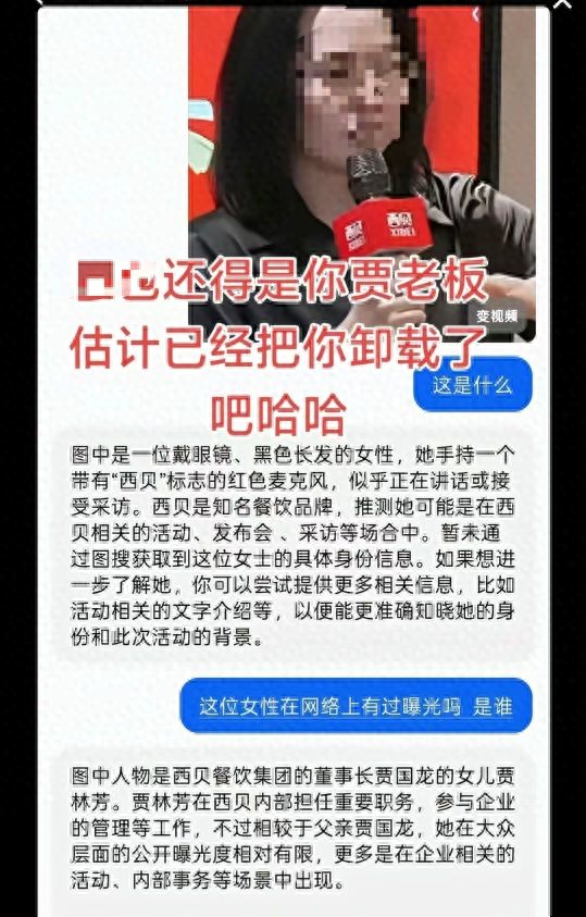 9月28日,记者注意到有网友指出,在某AI平台对“1岁孩子在西贝学会吃饭”中宝妈进行分析后,生成信息称该宝妈实为“西贝餐饮创始人、董事长贾国龙女儿贾林芳”,引发热议。